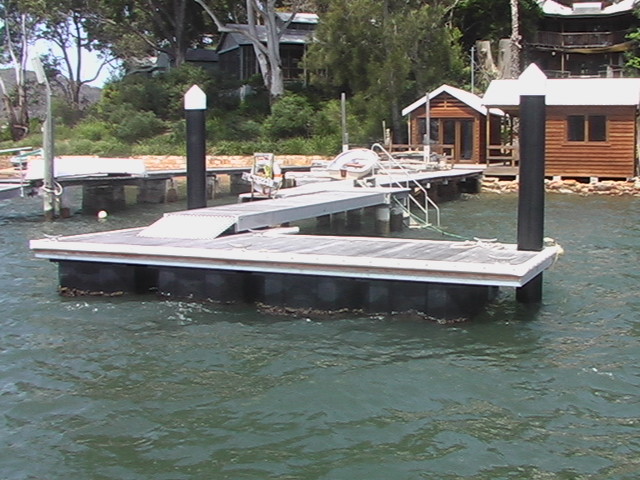 These are pictures of pontoons at Dangar Island Sydney Australia. All with Marine Dock Systems floats under them. Some recent, some built in 1980 and still going strong. There is a mix of timber framed pontoons decked with hardwood. Aluminium framed pontoons decked with hardwood timber. A lot of these photos also have our aluminium ramps / gangways on them. Some of these pontoons were built by someone else on our Marine Dock Systems floatation modules. Please veiw the photo's to see just what is possible with our universal pontoon system. | |